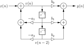 Direct Form 2 Biquad, using Robert Bristow Johnson’s equations.